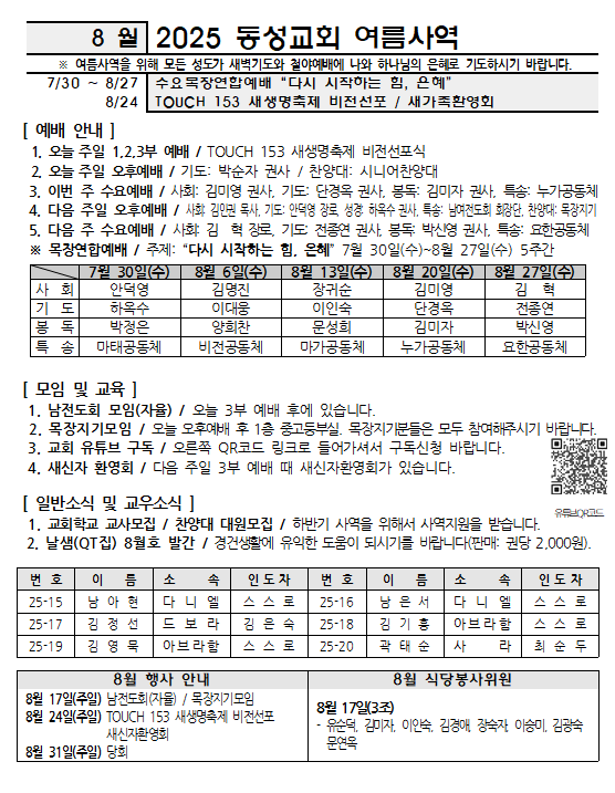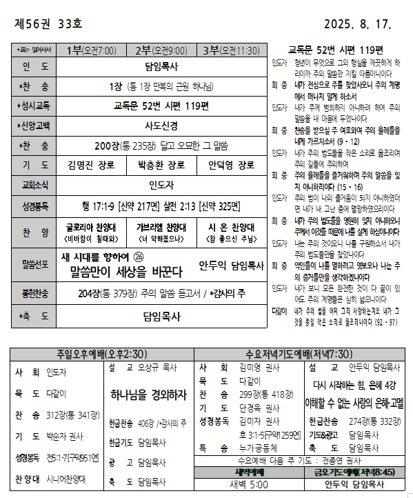 2025년 8월 17일 주보 페이지 정보 작성자 서버관리 댓글 작성일25-08-24 본문 2025년 8월 17일 주보 댓글목록 목록 교회주보 목록 번호 제목 글쓴이 조회 날짜 833 2025년 10월 12일 주보 서버관리 34 2025-10-12 832 2025년 10월 5일 주보 서버관리 145 2025-10-04 831 2025년 9월 28일 주보 서버관리 102 2025-10-04 830 2025년 9월 21일 주보 서버관리 197 2025-09-24 829 2025년 9월 14일 주보 서버관리 247 2025-09-16 828 2025년 9월 7일 주보 서버관리 498 2025-09-06 827 2025년 8월 31일 주보 서버관리 300 2025-09-03 826 2025년 8월 24일 주보 서버관리 868 2025-08-24 열람중 2025년 8월 17일 주보 서버관리 1066 2025-08-24 824 2025년 8월 10일 주보 서버관리 782 2025-08-10 823 2025년 8월 3일 주보 서버관리 849 2025-08-10 822 2025년 7월 27일 주보 서버관리 629 2025-08-10 821 2025년 7월 20일 주보 서버관리 879 2025-08-10 820 2025년 7월 13일 주보 서버관리 995 2025-07-15 819 2025_7_6 주보 서버관리 784 2025-07-05 818 2025. 6. 29 주보 서버관리 893 2025-07-01 열린1페이지 2페이지 3페이지 4페이지 5페이지 6페이지 7페이지 8페이지 9페이지 10페이지 다음 맨끝 검색대상 제목 내용 제목+내용 회원아이디 회원아이디(코) 글쓴이 글쓴이(코) 검색어 필수 검색