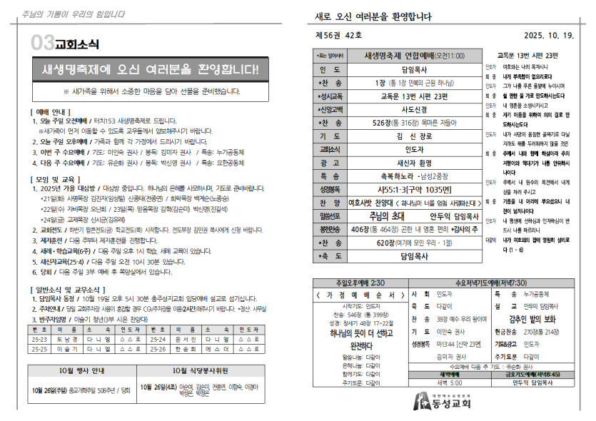 2025년 10월 19일 새생명축제 주보 페이지 정보 작성자 서버관리 댓글 작성일25-10-22 본문 2025년 10월 19일 새생명축제 주보 댓글목록 목록 교회주보 목록 번호 제목 글쓴이 조회 날짜 847 2026년 1월 18일 주보 서버관리 74 2026-01-17 846 2026년 1월 11일 주보 서버관리 66 2026-01-17 845 2026년 1월 4일 주보 서버관리 160 2026-01-07 844 2025년 12월 28일 주보 서버관리 169 2025-12-28 843 2025년 12월 21일 주보 서버관리 118 2025-12-27 842 2025년 12월 14일 주보 서버관리 249 2025-12-14 841 2025년 12월 7일 주보 서버관리 290 2025-12-07 840 2025년 11월 30일 주보 서버관리 252 2025-12-02 839 2025년 11월 23일 주보 서버관리 253 2025-11-25 838 2025년 11월 16일 주보 서버관리 289 2025-11-16 837 2025년 11월 9일 주보 서버관리 317 2025-11-11 836 2025년 11월 2일 주보 서버관리 299 2025-11-04 835 2025년 10월 26일 주보 서버관리 331 2025-10-28 열람중 2025년 10월 19일 새생명축제 주보 서버관리 366 2025-10-22 833 2025년 10월 12일 주보 서버관리 398 2025-10-12 832 2025년 10월 5일 주보 서버관리 446 2025-10-04 열린1페이지 2페이지 3페이지 4페이지 5페이지 6페이지 7페이지 8페이지 9페이지 10페이지 다음 맨끝 검색대상 제목 내용 제목+내용 회원아이디 회원아이디(코) 글쓴이 글쓴이(코) 검색어 필수 검색